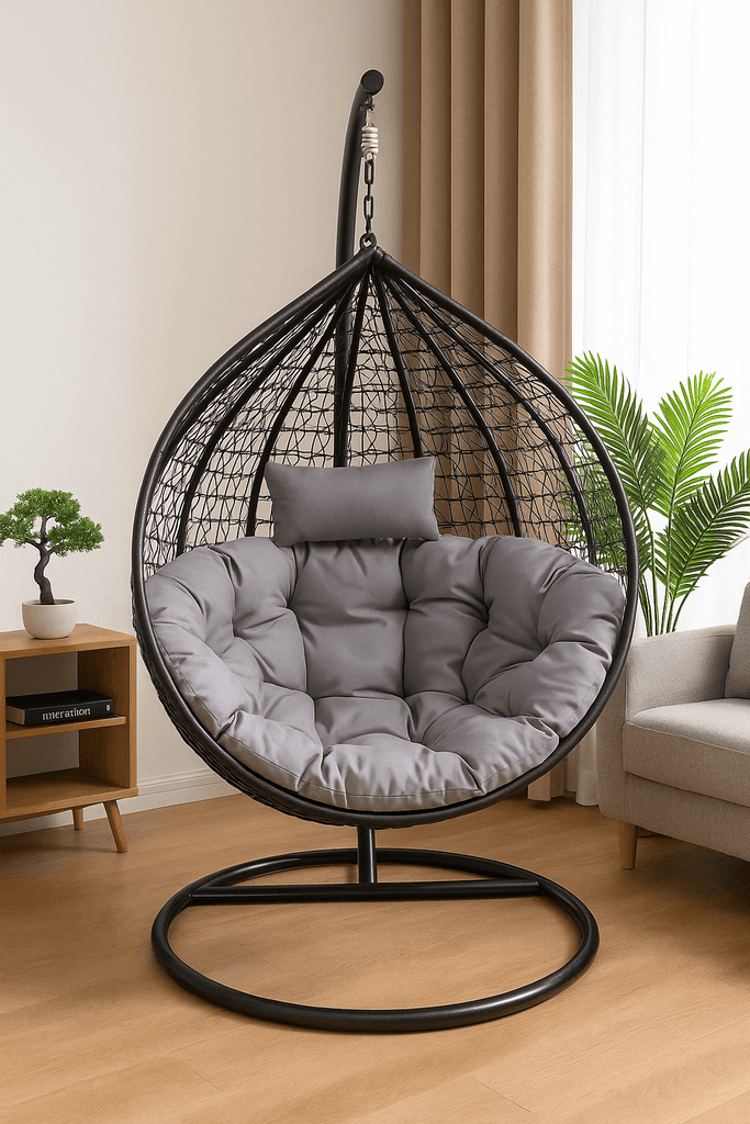 We offer quite a great number of options. Our selection of black egg chairs for sale is not limited to the variety of materials. We also offer egg chairs made in a woven pattern, net pattern as well as striped. The black egg chairs swing gently in the air by balancing your weight on a sturdy circular stand and attachment from above. Though they have an elegantly delicate appearance, our black egg chair with a stand is sturdier than it looks. These stylish chairs can bear up to 140 kgs of weight.