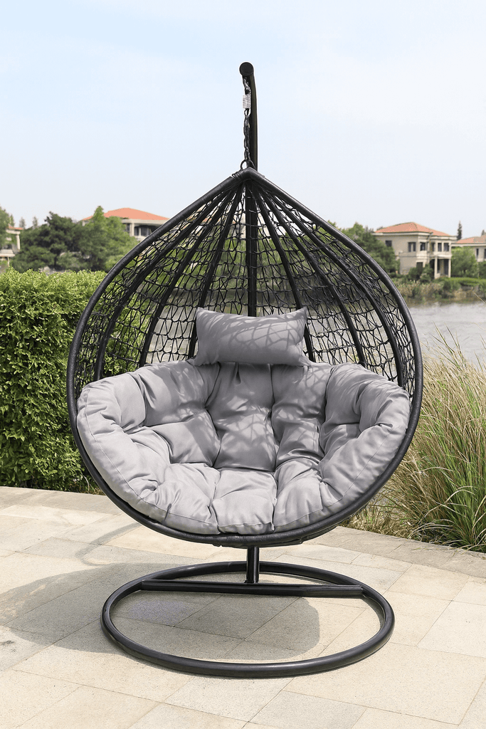 SoloNest - Single Seater Freestanding Hanging Egg Chair - Black Chair / Grey Pillow