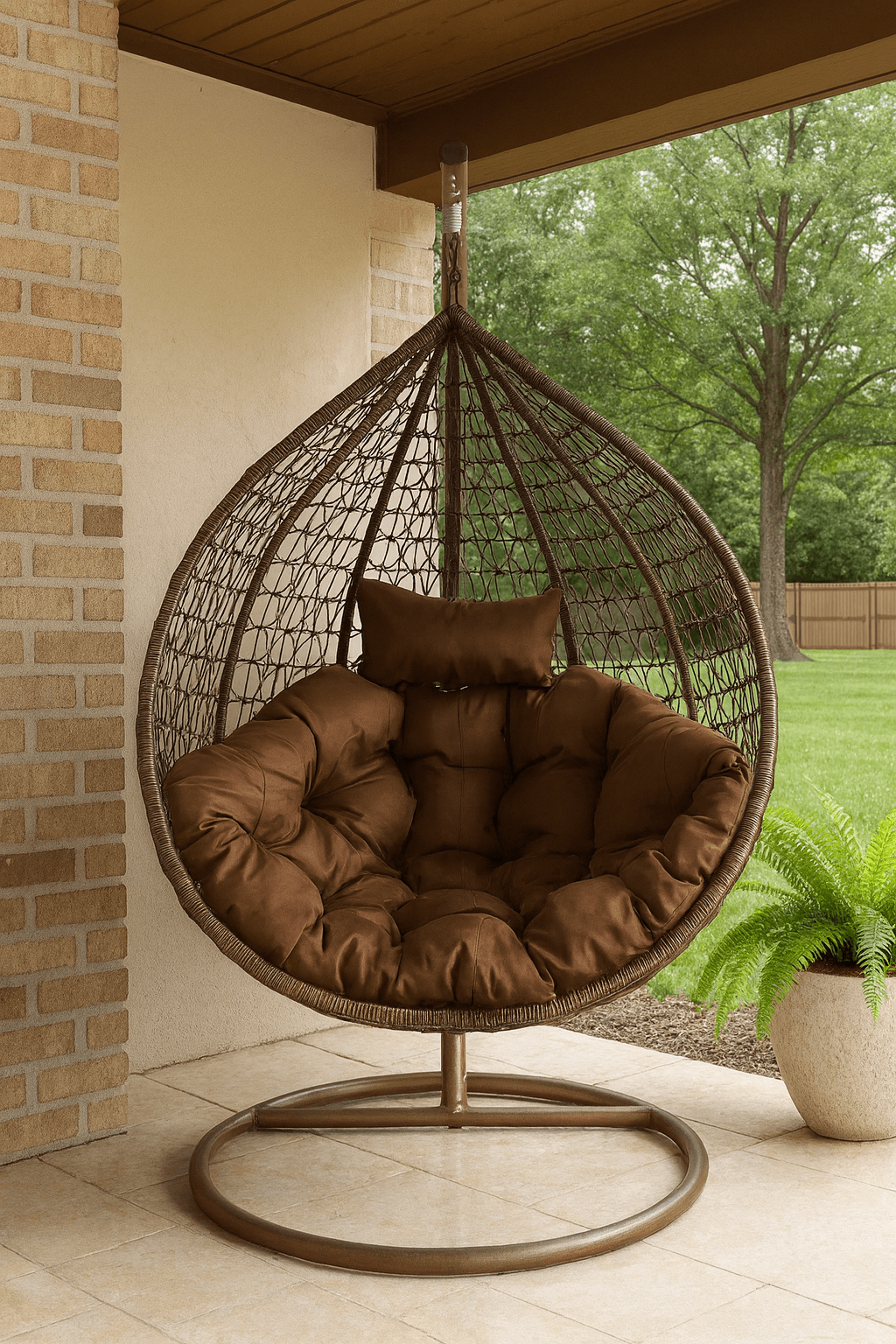 Sink into the soothing vibes of the SoloNest Brown Egg Chair — the perfect mix of rustic charm and everyday comfort. With its rich woven rattan basket and matching brown cushions, this freestanding beauty blends effortlessly into nature-inspired spaces, patios, or cozy reading corners.