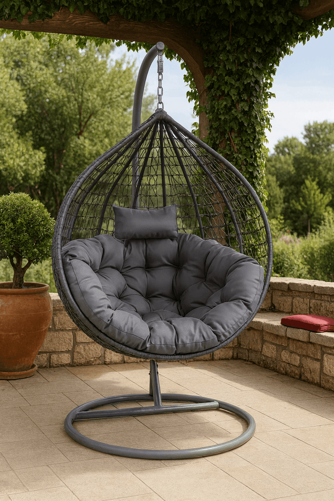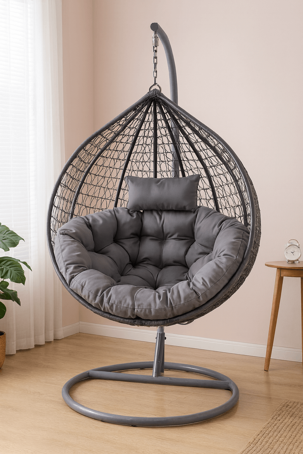 Relax in modern style with the SoloNest Grey Single Seater Hanging Egg Chair, elegantly paired with matching grey cushions for a seamless, contemporary look. Crafted from weather-resistant synthetic rattan with a sturdy powder-coated steel frame, this freestanding chair is both durable and visually striking. The deep seat and soft cushions offer exceptional comfort for reading, lounging, or enjoying your morning coffee.