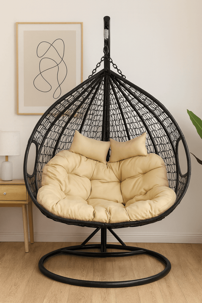 The Double Seat Hanging Egg Chair – Black Basket with Brown Cushion brings natural tones and modern form together in one cozy retreat. Featuring a handwoven black PE rattan pod and soft earthy brown cushions, it’s the perfect blend of style and comfort for two.